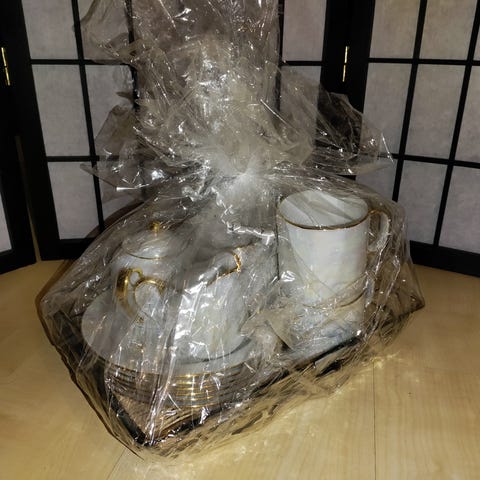 Tee-laatikko, jossa on kuusi lokeroa. Materiaalina valkoinen puu ja kansi, jossa lasi-ikkuna. Laatikko on tarkoitettu teepussien säilytykseen. Hyväkuntoinen