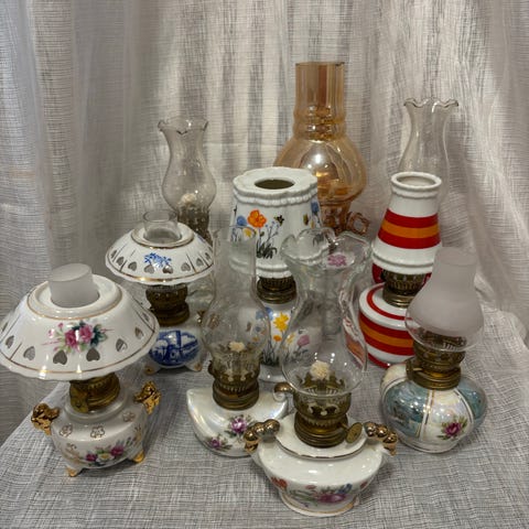 Kuvan mukaiset 5kpl posliini öljylamppuja, kuvut lasia. Myydään joko yhdessä tai erikseen.