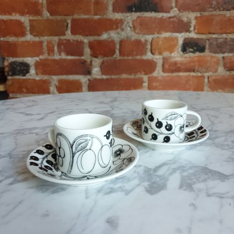 Arabia Paratiisi kahvikuppi ja lautaset mustavalkoinen