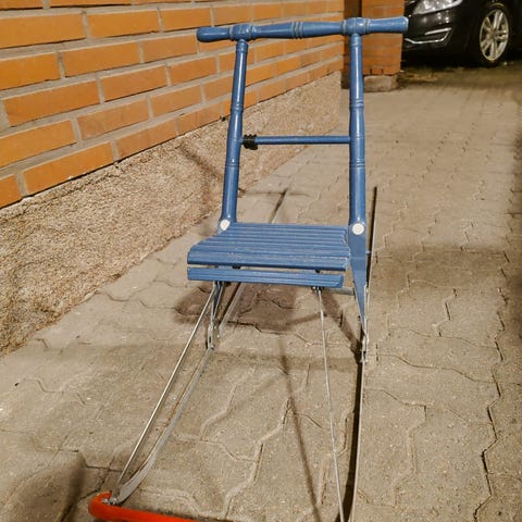 Vähän käytetty, pidetty kuivassa tilassa. Potkukelkassa lisävarusteina jalkatuet ja liukujalakset.