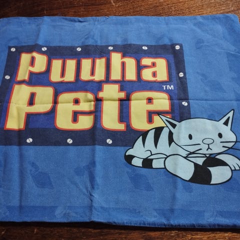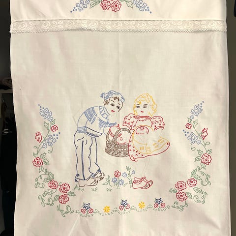 Ohutta valkoista puuvillakangasta, siihen kiva kuva painettu vihreällä värullä. Yläosan koristeosassa kukkakuvio, isommassa peiteosassa merihenkinen kiva kjuva. Hinta 5 ja toimitus