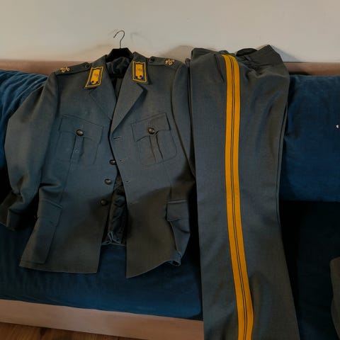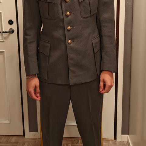 Vaasan rannikkopatteriston vääpelinpuku. Takki, kahdet housut(saapas/pussihousut), mantteli, vyö ja saappaat. Koko 48C. Takeissa olkatoppaukset. 100 €. Nouto Lempäälä, lähellä Tampereen rajaa. Kulkeutuu Hervanta/Koikkari/Linnainmaa. Postitus 10 € kuluilla.