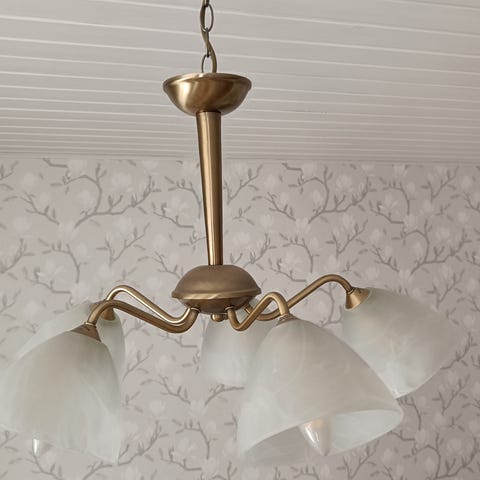 Uusi valaisin avaamattomassa pakkauksessaan. Opaalilasia, jossa kauniit kuviot.