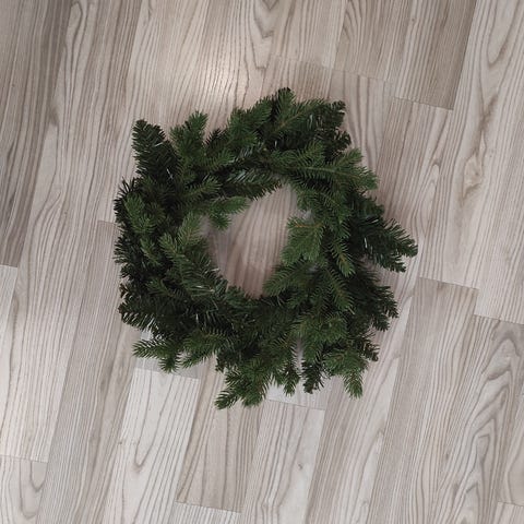 Myydään jättikranssi, jonka ulkohalkaisija on 80 cm. Tehty pyörän vanteen ympärille, joten todella jämäkkä pohja. Havuina käytetty männyn-, kuusen- sekä hopeakuusen havuja.