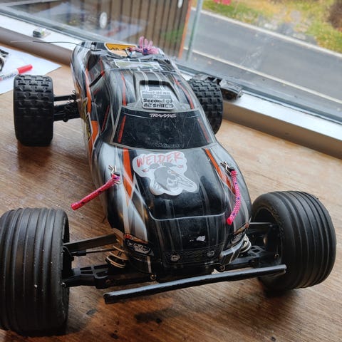 Sähkökäyttöinen RC-auto off-road oranssilla korilla. Auto sisältää iskunvaimentimet, suuret renkaat ja kauko-ohjaimen. Mukana varaosia ja lisävarusteita, kuten renkaita ja osia huoltoa varten.