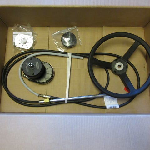 Ohjauspyörä ja ohjausyksikkö veneen ohjaukseen. Väriltään valkoinen ohjausyksikkö ja musta ohjauspyörä. Soveltuu veneisiin, joissa tarvitaan ohjausjärjestelmän komponentteja.