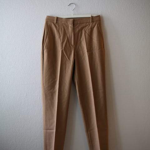 Ohutta toimikassidoksista 99% villaa, 1% elastaania. Vyötärön ympärys 81cm. Haaramitta edestä vyötärönauhsn yläreunasta haaran kautta taakse vyötärönauhan yläreunaan 66cm. Sivupituus 101,5cm. Reiden ympärys haaran kohdalta 60cm. Myös Masdimo Dutin villakangasjakku myynnissä. Housut kulkeutuvat postissa S kokoisessa paketissa 7,9e