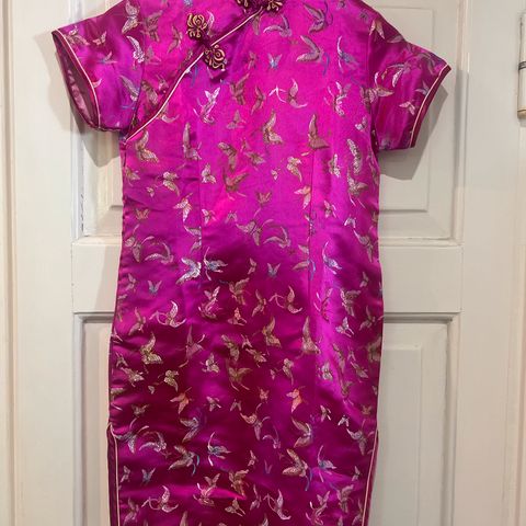 Kaunis kiinalaistyylinen juhlamekko koossa 110. Satiinimainen kiiltävä kangas ja perinteinen kuviointi. Hyvässä kunnossa, käytetty vain muutama kerta. Sopii juhliin, naamiaisiin tai leikkeihin.
