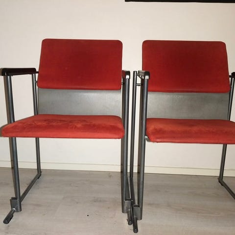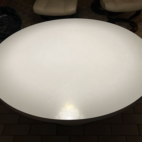 Yrjö Kukkapuro ruokapöytä, jossa valkoinen pyöreä pöytälevy ja punainen jalusta. Mukana oranssit muoviset tuolit, joissa kromatut metallijalat. Tuolit ovat muotoiltuja ja kantavat modernin designin piirteitä.