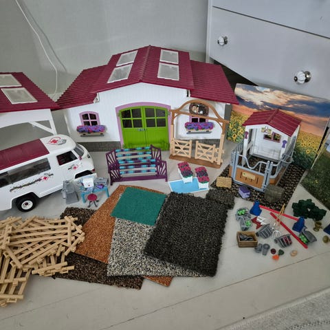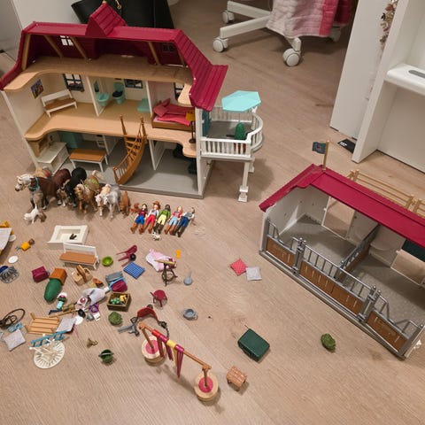 Myydään Schleich setti. Settiin sisältyy talli, auto ja traileri, 6 hevosta, ratsastaja ja kuski sekä neljä erilaista estettä.