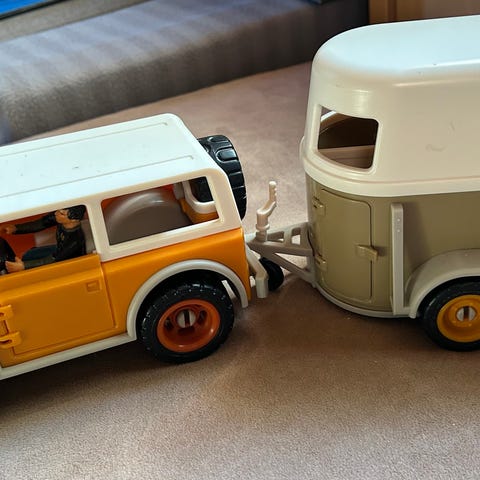 Kaikki viat näkyvät kuvissa eli pieniä kynänjälkiä muutamissa kohdissa (saattavat lähteä), trailerin takaa ja sisältä puuttuu osat, tallin ovesta puuttuu pieni sininen nuppi.