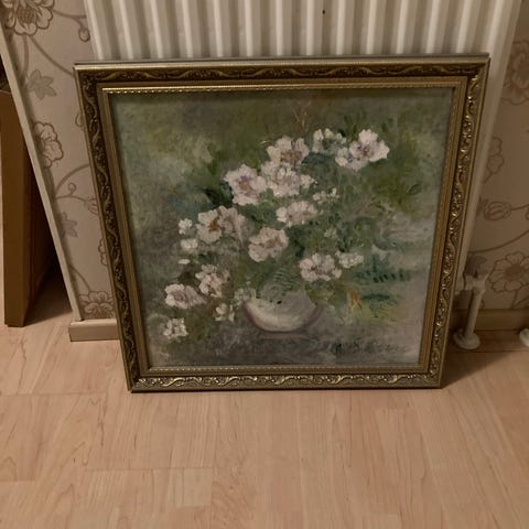 Öljyvärimaalaus, jossa on kukkakuvio ja kulta kehys. Kehyksen takana ripustuslanka. Kuvassa kukkia maljakossa, tausta tummanruskea.