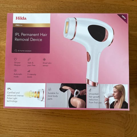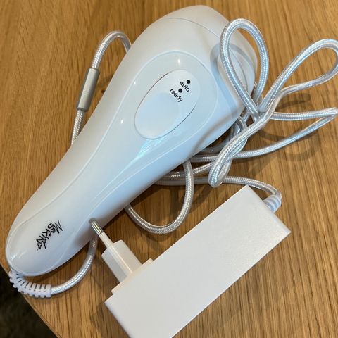 Mandy Skin IPL-laite valkoisena. Laite on tarkoitettu karvanpoistoon. Mukana alkuperäinen laatikko, käyttöohje ja virtajohto. Extrana ylellinen säilytyspussukka. Kerran kokeiltu, jäänyt käyttämättä.