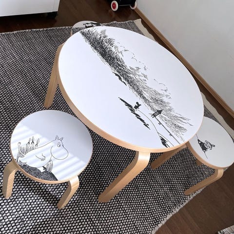 Myydään Artekin muumipöytä sekä kaksi tuolia. Pöydän halkaisija 75cm, korkeus 60cm. Mukana myös käyttämättömät korkeat jalat. Siistit ja hyväkuntoiset.