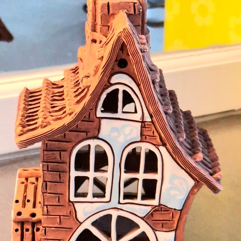 Myynnissä kuvien keraaminen hieman erilainen lyhty tuikkivalle. Pituus on 18 cm. Katon sisäpuolelta on pari kiinnikettä pois, mutta katto pysyy kyllä paikallaan, kun sen siihen laskee. Lähetän ja kulut ovat 7,50 e, kulkeutuu myös Turkuun ilmaiseksi