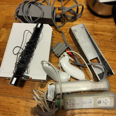 Nintendo Wii pelikonsoli valkoisena, sisältää ohjaimen ja käyttöohjeet. Liitännät televisioon ja ohjaimen liitäntä mukana.