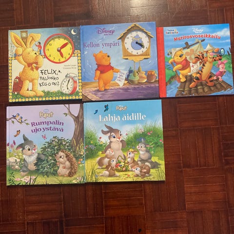 Kokoelma lastenkirjoja, sisältäen Disney-aiheisia kirjoja ym.Kirjat ovat pehmeä kantisia, ohuita ja erikokoisia. Sisältävät värikkäitä kuvituksia, sopivia lasten lukemiseen ja tarinankerrontaan.