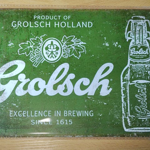 Peltikyltti, olutaiheinen, Grolsch vaikka baariin, autotalliin, äijäluolaan, mimmiluolaan tai miksei olohuoneeseen.
