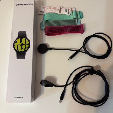 Samsung Galaxy Watch6 Classic älykello, jossa valkoinen nahkaranneke. Kellossa on pyöreä näyttö ja se tukee puhelinyhteyksiä. Mukana tulee latauskaapeli ja latausalusta.