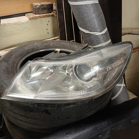 Vm 2016, 5e5 Octavian vasen takalamppu. Ulkokehän vaakarivi pimeä ja linssi halki oikeasta yläkulmasta, muuten toimiva lamppu, liitin purettu toiseen lamppuun.