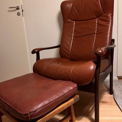 Isompaa kotia etsii kaksi aitonahkaista mustanruskeaa, muhkeaa nojatuolia. Istuinkorkeus n.40cm. Lujatekoiset. Pohjassa merkki Insofa, eli Askon kotimaista laatua. Metallijalat, tyynyt irralliset, pohjassa jousitus. 70€/1kpl tai 120€/2kpl.