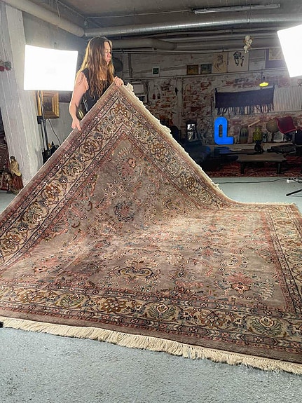 Käsinsolmittu silkistä puuvillaloimelle. N. 500 000 solmua/neliömetri.