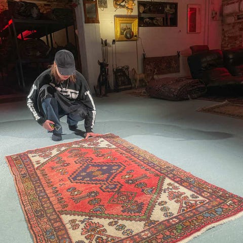käsinsolmittu itämainen aitomatto villamatto vintage persialainen aito villa hamadan pieni vaaleanpunainen sininen violetti matto käsinkudottu käsin käsintehty käsityö antiikkimatto vintagematto helsinki helsingissä