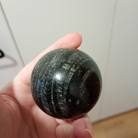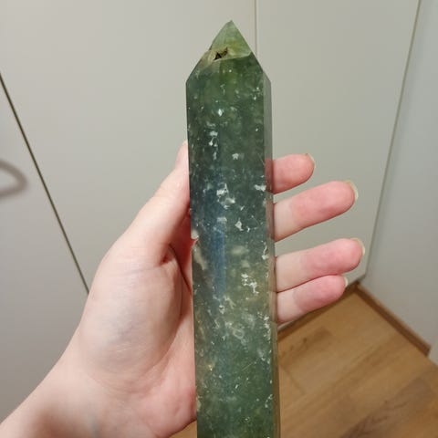 Sininen tiikerinsilmä, eli haukansilmä kristalli kivi torni. Seisoo vähän kenossa ja kärjessä pieni kolhu. Kaunis sininen kiille valossa, yritin parhaani kuvata sen.