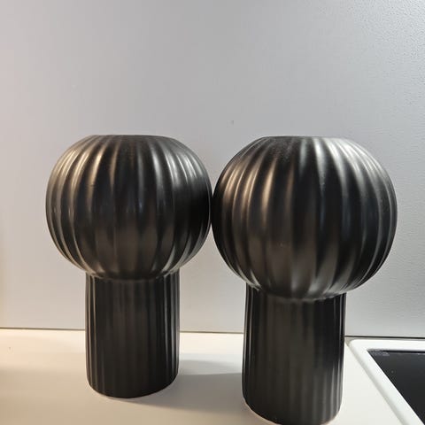 Pienet lasimaljakot, korkeus 10 cm. Väreinä vihreä ja keltainen. Ostettu Prismasta häitä varten, mutta jäivätkin kokonaan käyttämättä.