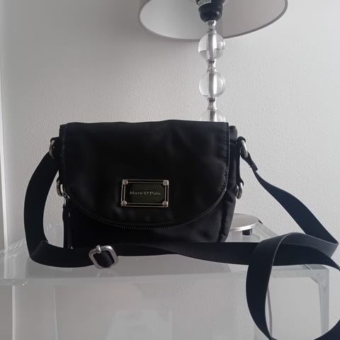 Laukussa on säädettävä olkahihna ja vetoketjulliset taskut läpässä, takana ja sisällä. Sisäpuolella lisäksi kaksi pikkutaskua. Materiaalina kestävä kangas. Korkeus 18 cm, leveys 24 cm.
