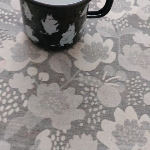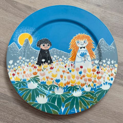Peltinen muumi tarjotin, halkaisijaltaan 32 cm ja reunat hieman yli 2 cm.