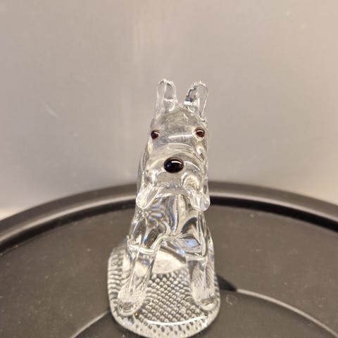 Lasinen koriste koira kimalteella, kullanvärinen ripustuslenkki. Höyhentä päälaella. Leveimmillään n.13,5, syvimmillään n.8,5cm, korkeimmillaan n.7,5cm. Käyttämätön.
