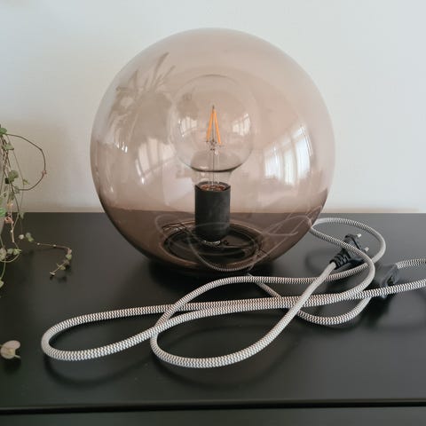 Hyväkuntoinen ja siisti pöytävalaisin, kupu ruskeaa lasia. Korkeus 24 cm. Isokantainen lamppu, helppo vaihtaa.