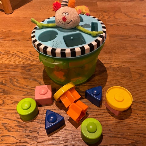Vauvojen/taaperoiden palikkapeli. Paloja on ollut alunperin 10, mutta vain 8 on tallessa.
