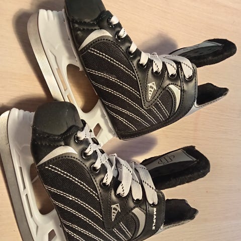 Chicago Super 1100 jääkiekko luistimet lasten koko n. 25 eli sisämitta 15cm eikä kokoa näy missään, enkä sitä enää muista. Pohjalliset ja nauhat hyvässä kunnossa, kannattaa teroittaa ennen käyttöä.
