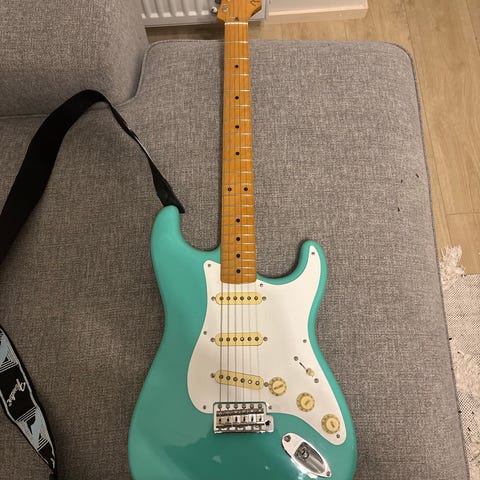 Todella vähän soitettu 2022 ostettu erikoismalli jv mod 60s stratocaster. (Made in Japan) Ensimmäisessä kuvassa oikeanpuoleinen väri Olumpic white. Näitä valmistettiin käsittääkseni vain yhden vuoden ajan. Kaulan profiili soft V Todella hieno viimeistely ja on kyllä hienoin kitara mitä olen käsissäni pitänyt. Yksi melko huomaamaton tulitikun pään kokoinen kolhu bodyssä. Alimmassa potikassa pull up toiminto millä saa kaulamikin päälle.