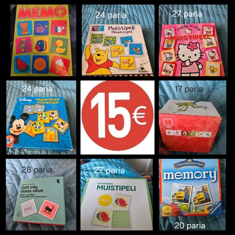 Myydään kuvan mukaiset muistipelit ja kirjainpeli +4 vuotiaasta. Hinta yhteensä 10 euroa, katso myös ilmoituksen muut pelit.
