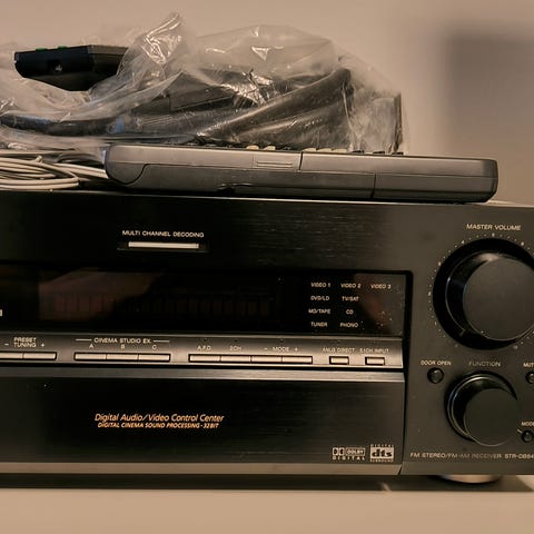Dvd-asema. Yksi johto rikki, koira puri. Onko kaikki johdot, en osaa sanoa, iso kasa kuitenkin.