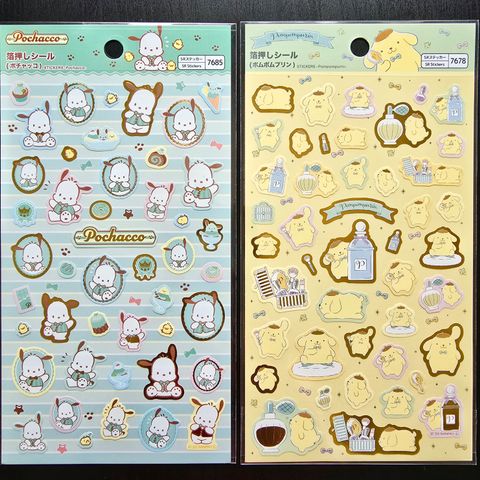Uudet ja käyttämättömät Sanrio tarra-arkit Japanista: My Melody x Kuromi, Cinnamoroll, Pompompurin ja Kuromi.