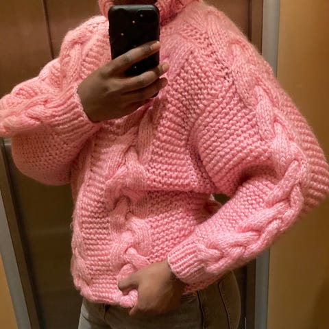 Billie-merkkinen neule, 80%akryylia, 20% polyesteri. Pituus 54cm, hihan pituus 58cm, ympärysmitta 88cm. Avara pääntie, iso kaulus. Nouto Mäntylästä.