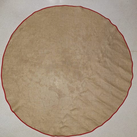 Säkkikankainen pöytäliina on kantattu punaisella nauhalla. Liina soveltuu jouluiseen sisustukseen.