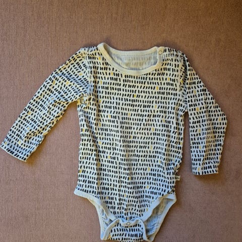 Kuviollinen keltainen body koossa 68/74. Alun perin vuoden 2022 äitiyspakkauksesta.