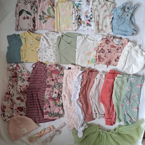 H&M lastenvaatteet kirjava kuosi, koko 68-74 cm, suunnattu tytöille. Mukana erilaisia vaatekappaleita eri väreissä ja kuoseissa.
