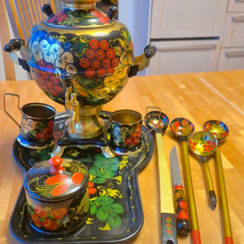 Uusi samovaari ( ei käytön ) ja 6 kupinpidike.
