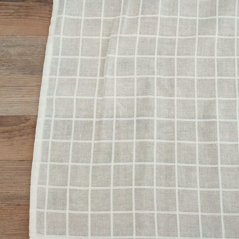 Kappa, beige, ruutuinen. Vähän karheaa läpikuultavaa kangasta. Rypytysnauha. Nipsuilla kiinnitettävä. Mitat n. 40 cm x 5 metriä.