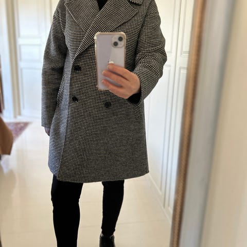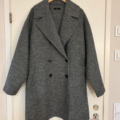 Nanso villakangastakki mustassa värissä. Takissa on kaksirivinen napitus ja kaulus, jossa on kontrastivärinen vihreä sisäpuoli. Materiaali pääosin villaa, sopii viileisiin säihin ja arkipukeutumiseen.