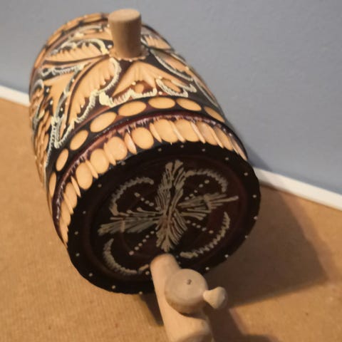 Tynnyri koristeeksi. Mahdollisesti alpakkaa. Pituus n.20cm. Mukaan 6 kpl kuppeja. Vain nouto.
