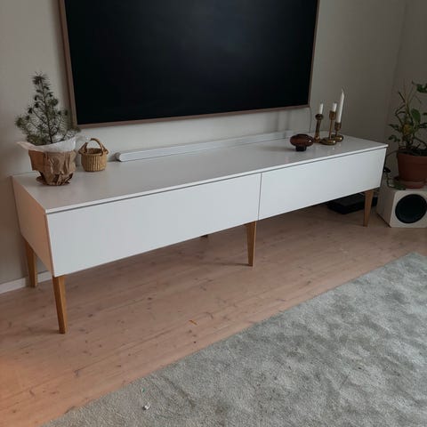 Massiivipuinen pyörillä oleva siisti ja hyväkuntoinen TV-taso. Lasihylly sisällä, joten tasoon mahtuu sisälle yhteensä 4 standardilevyistä laitetta. Sisäleveys 90 cm.