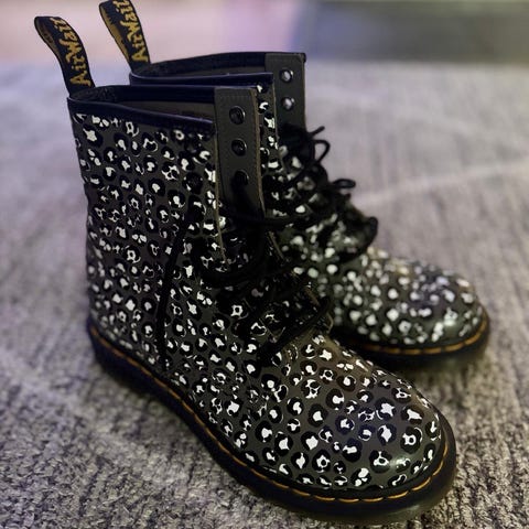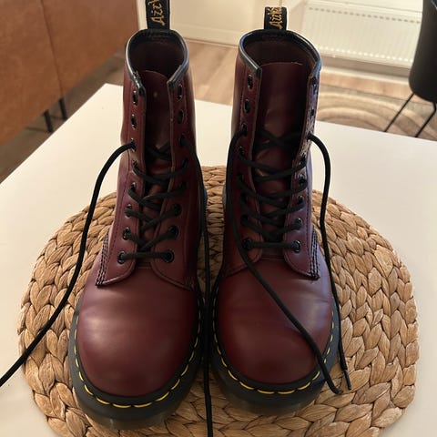 Dr. Martens saappaat, kiiltonahka. Noin neljä vuotta vanhat, mutta satunnaisella käytöllä olleet. Kärjissä taitekohdassa on ”rypyt”, jotka ovat tulleet ihan normaalista kävelystä ja käytöstä. Muuten ovat hyvässä kunnossa!