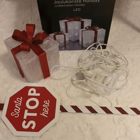 Joulu /kausivalot,yksi lasipallo rikki,ei haittaa käytössä. Toimii paristolla.